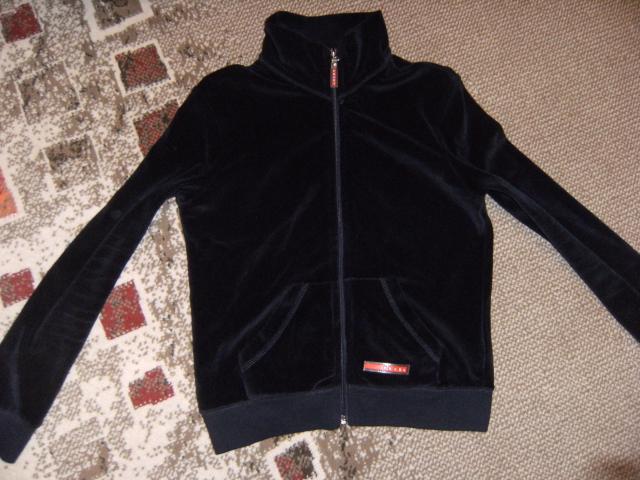 Pirkau ne Lietuvoje inernetu,parasytas dydis M,bet man labai ankstas,tai manyciau labiau tiktu S arba net xs.Smulkiai, zemai merginukei,butu kaip tik:)Pirkau nauja,su etikete,ir buvau karta uzsidejus.Tai siek tiek rankos per lenkima matos(trecia foto)kad buvau uzsidejus,bet tik tiek :)Medziaga tai kaip mes vadiname ne lietuviskai barchatas arba peliukas.Spalva taimsiai melyna.Apacioje ir ant uztrauktuko,Prada zenkliukas.Made in Italy.