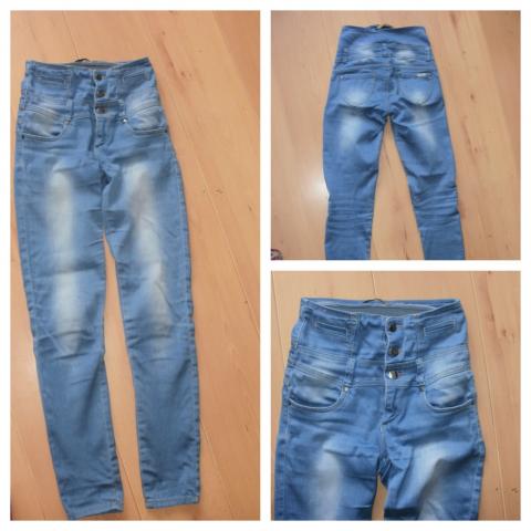 Mažai devėti džinsiukai prailgintu liemeniu. Sudėtyje yra 2% elestano, todėl gana daug tamposi ir yra labai patogūs. Be elastano į sudėtį įeina 68% medvilnės ir 30% polisterio, taigi tikrai kokybiški džinsiukai, nedažantys. Ilgis su liemeniu 105cm