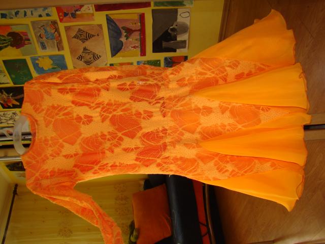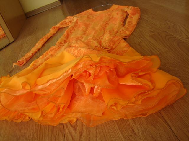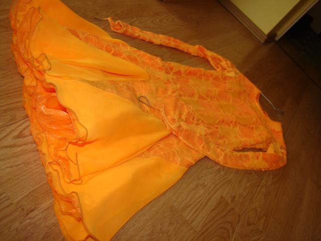 Puikios būklės pramoginių šokių suknelė, oranžinės spalvos, teirautis šiuo numeriu 861037600 , išmatavimai : ilgis suknelės 80cm , rankovių ilgis 55cm , ilgis iki juosmens 43cm , krūtinės apimtis 70cm .