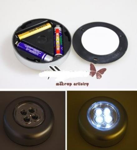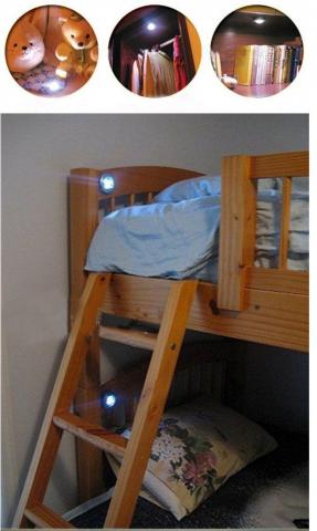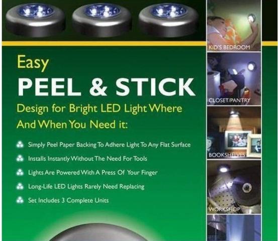 Priklijuojamas 3 LED šviestuvas Priklijuojamas bet kuriame lygiame, sausame paviršiuje specialaus libduko pagalba. Maitinimas 3 AAA tipo baterijos 3 LED šviestuvas Ijungimas paspaudus Matmenys: 7cm x 2 cm kaina 11 lt /vnt