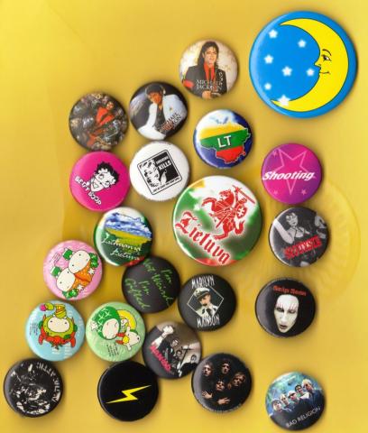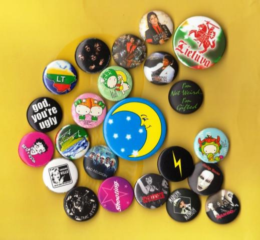 Įvairiausi beveik nauji ženkliukai: Michael Jackson, "Rancid", "Bad Religion", Siuoxsie, Marilyn Manson, "Queen", Betty Boop, patriotiniai ir k.t. Po 1 Lt (ar pigiau, jei perkate daugiau vnt.).