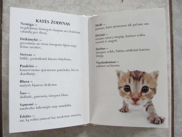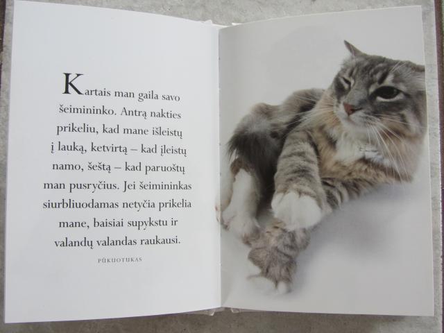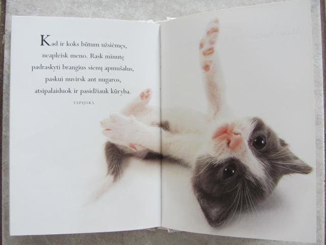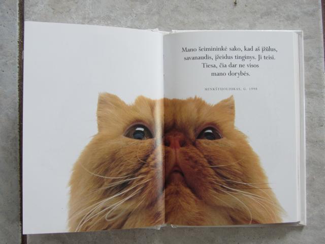 Knyga kietu viršeliu, 96 puslapiai su kačių nuotraukomis ir priderintais tekstais. Žaisminga, linksma, nuotaikinga