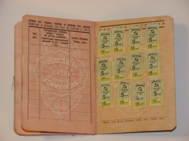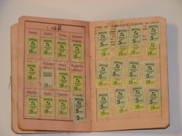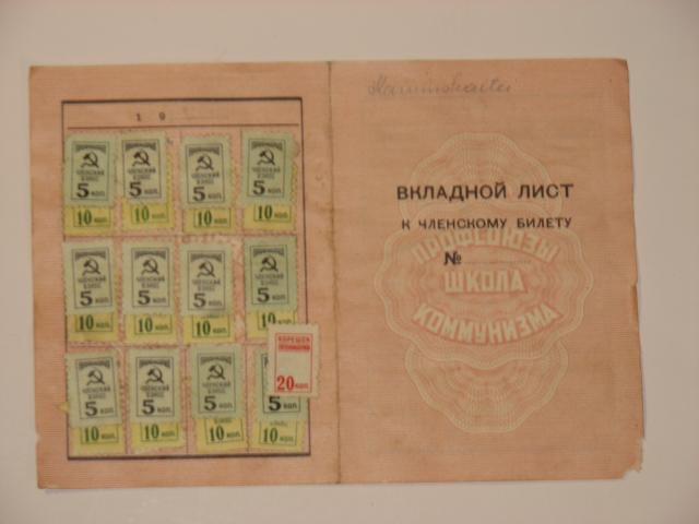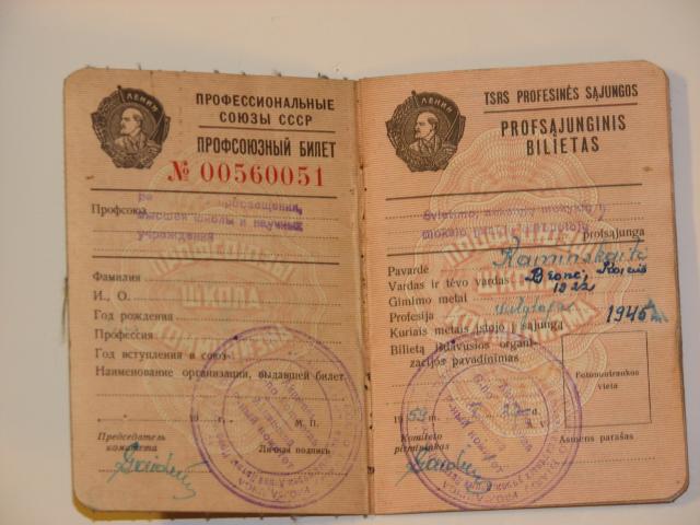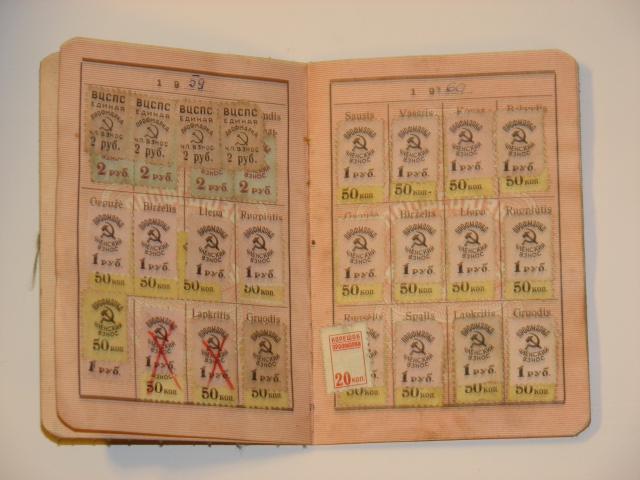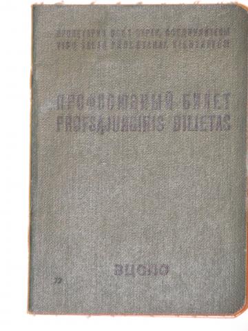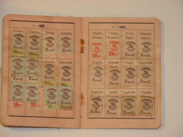 Profsąjungos bilietas 1945m. su užpildytais lapais įmokomis, bei papildomas įdėtinis lapas (paskutinė foto).
