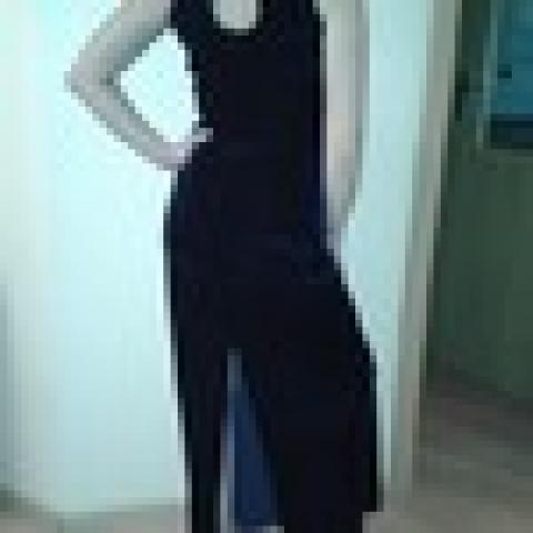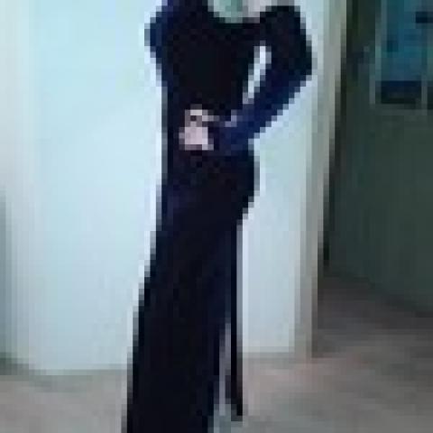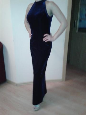 tamsiai mėlyna aksominė, 2 kartus dėvėta, be defektų, yra pirštinės, ilgis 134 cm (plačiau matmenų - klauskit). S- M dydis- tampri medžiaga. JOKIŲ DEFEKTŲ!