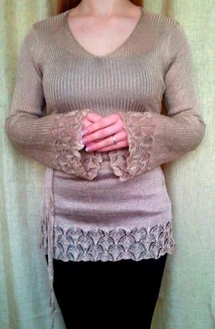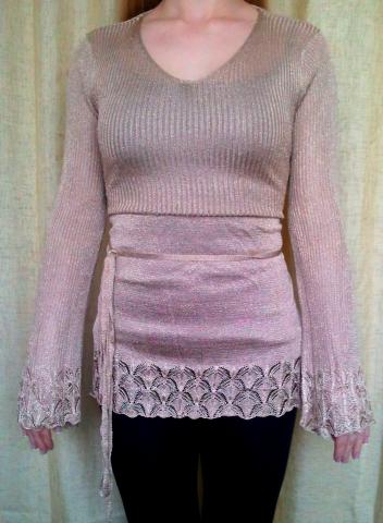 Proginė aukso spalvos tunika. Blizgi medžiaga, v kakliuku. Dydis reguliuojamas suvarstomu dirželiu. Tinka dydžiams nuo XS iki L.