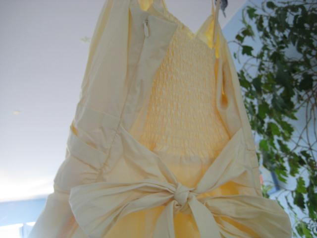 Kartą buvau užsidėjus. Suknelė puošni, tačiau neperkrauta. Spalva panaši - švelniai gelsva. Gale susiriša mazgelis. Ji nėra pūsta, tačiau laisva krenta ir atrodo tikrai labai gražiai. Dydis 34. Pirkta iš Reserved parduotuvės. Kreiptis galima ir el. paštu: laura7771@gmail.com