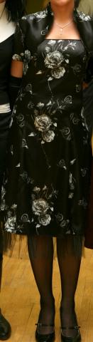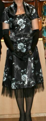 Tik vieną kartą užsidėta. Be defektų. Fotografuota ant 1,65m ūgio panelės,nešiojančios S-M dydį, dydis reguliuojamas. Iš nugaros dysis reguliuojasi juostelėmis. suknele susideda is dvieju daliu (sukneles ant petneseliu ir bolero) Suknelė parduodama be pirštinių.