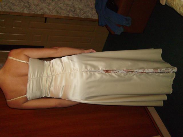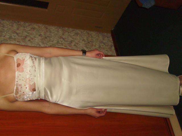Šampaninės spalvos atlasine ,,vila'' firmos suknelė dėvėta viena karta priedas bolero švarkelis