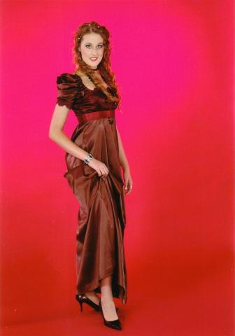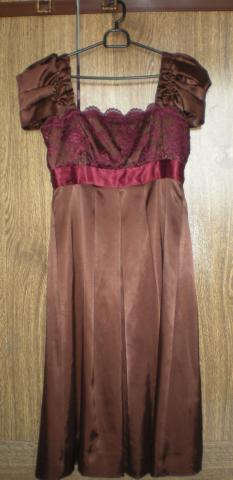 Šokolado spalvos šlapio šilko su elastanu bei bordo spalvos gifiurinėmis detalėmis proginė suknėlė. Nuotraukose pateikta ilga tik dėl vaizdo, kad būtų vizualiau, be dabar ji yra nukirpta, truputėli dengianti kelius. Prie jos galiu pridėti ir bordo spalvos batelius.