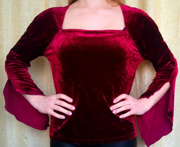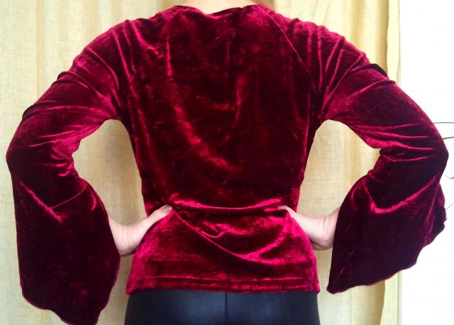 Proginė veliūrinė palaidinė. Gili iškirptė, bordo spalvos. Tinka ir su kostiumėliais. M dyždio, bet laisvai tempiasi iki L-XL.