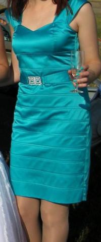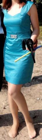 proginė žydra suknelė, žvilgančios slidžios medžiagos. Dydis ant etiketės 42 , bet buvo taisyta siuvykloje - mažinta, tad dabar atitiktų veikiausiai 38/40 dydį. Siaurinant suknelę taip pat buvo nukirpta ir etiketė kurioje buvo sudėtis, tad ją aprašyti galiu nebent spėdama iš turimos panašios suknelės, kad ji susideda iš medvilnės, elastano ir poliesterio. :) išmatavimai: ilgis nuo petnešėlės - 92 cm ilgis nuo pažasties - 77 cm krūtinė - 85 cm klubai - apie 100 cm juosmuo - apie 80 cm dėvėta tik
