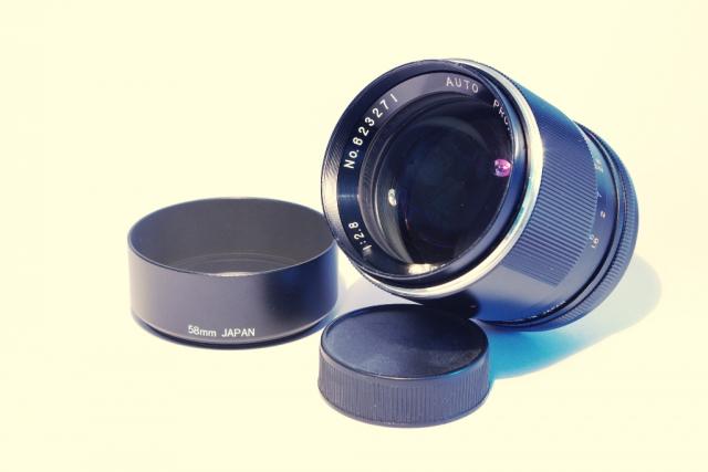 Promura MC f=135 1:2.8. Objektyvas su Minolta M/MD bajonetu. Komplekte metalinė blenda ir galinis dangtelis.
