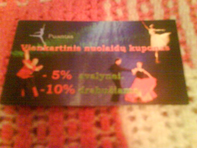 vienkartine puanto nuolaidu kortele. su ja suteikiama 10% nuolaidos drabuziams ir 5% avalinei