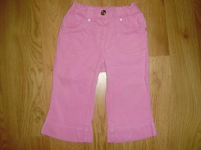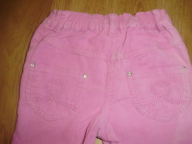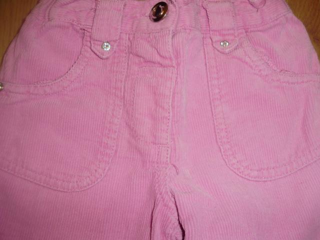 Gražios velevetinės kelnytės su kišenėmis priekyje ir užpakalyje. Užsisega sagute, juosmuo su gumute, iš vidaus dar reguliuojasi dydis, yra kilputės diržui. Tinka 9-12 mėn. kūdikiui. Dydis 80 cm. Kelnių ilgis - 40 cm.