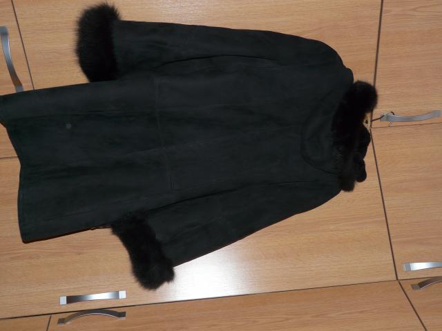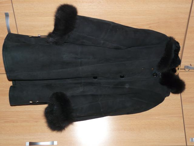 natūrali juoda oda. vidus natūralus kailis. rankogaliuose lapės kailis.Yra šniureliai,galima kažkiek susisiaurinti rankoves. Yra kapišonas. ilgis nuo pečių-100-102 vidinė siūlė nuo pažasties-apie 41cm per krūtinę apie 53x2