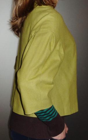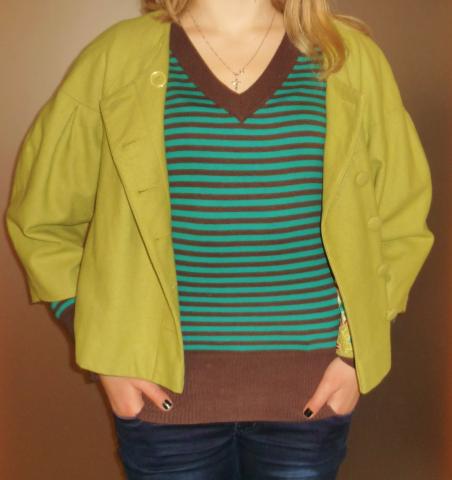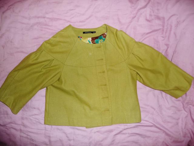 Puikus žalias paltukas - švarkelis tinkantis rudenį, pavasarį bei vasarą, yra 40 dydžio, tačiau aš nešioju S ir man gražiai atrodė. Tad tinka beveik bet kokiam dydžiui, nes nėra įliemenuotas, bei nesimato pečių linijos. Yra platus,na, kažkas panašaus į varpelio formą.