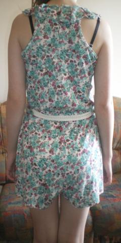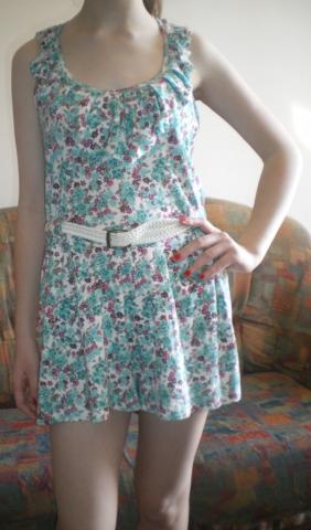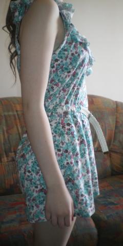 Kombinezonas, užsidėjus atrodo kaip suknelė, užsidėta tik vieną kartą. Raštas gėlėtas, susegama baltu dirželiu.