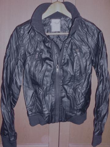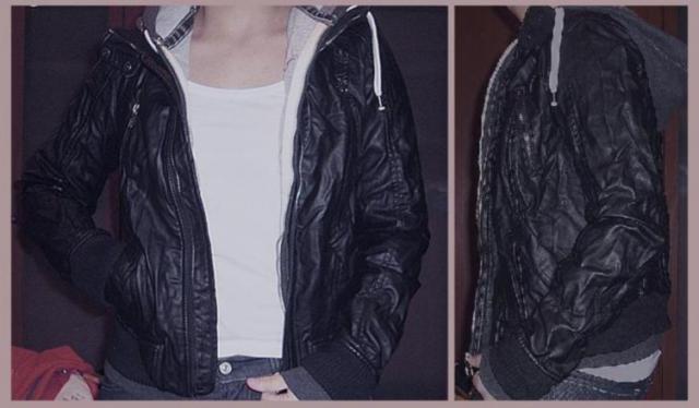 pirkta prieš porą metų, vidinėje pusėje vienoj vietoj susiūtas pamušalas, kitoj, taip pat iš vidaus, nedidelė pradeginta skylutė. iš išorės matosi tik kai kur netikros odos nusitrynimai ties siūlėmis. matosi, kad daiktas ne naujas, bet būklė tikrai nėra tragiška. pirmos ft darytos beveik iškart po pirkimo, trečia neseniai; joje matosi, kad striukė iš tikrųjų nėra glamžyta.