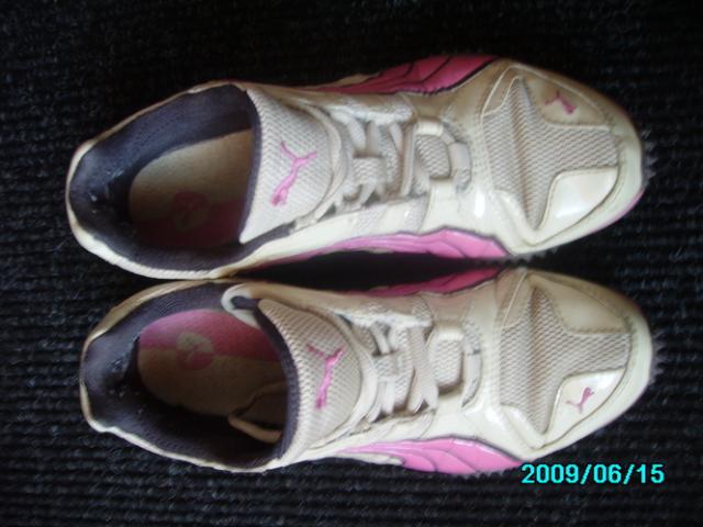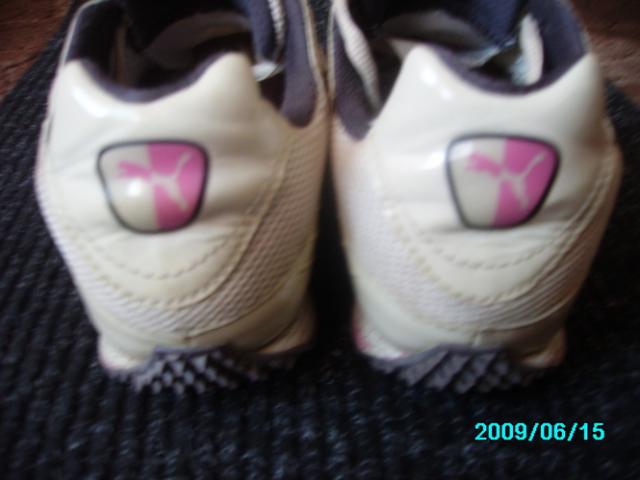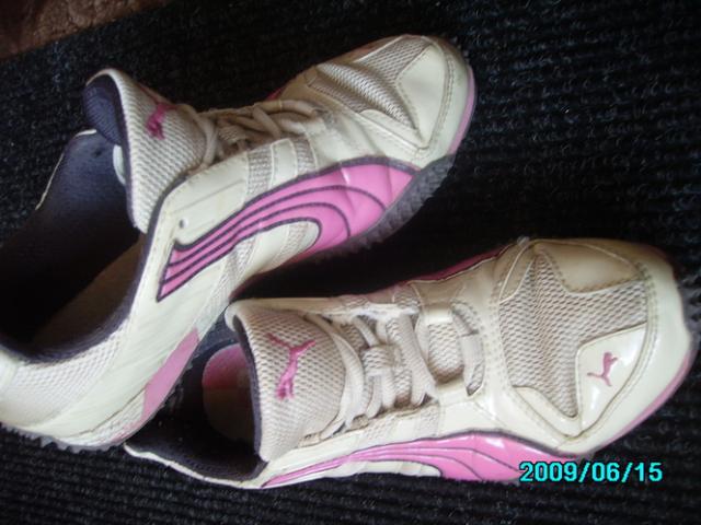 37,5 dydžio originalūs pumos kedukai.Labai patogūs,tačiau man jau atsibodę.Yra vienas defektas-pasitrynę ties kulnimis iš vidinės pusės,bet kai apsimauni nesimato:) niekur kitur neįplyšę ir neatsiklijavę :)