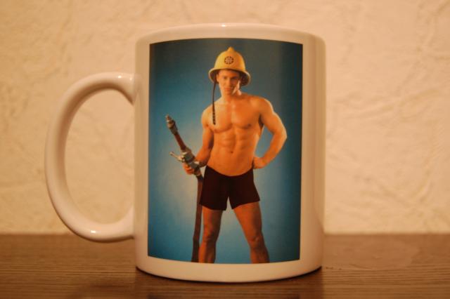 Linksmas puodukas. Įpylus karšto skysčio, paveikslėlyje esančio ugniagesio trumpikės pranyksta.