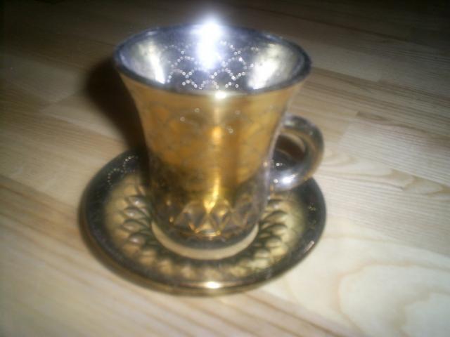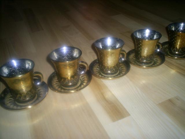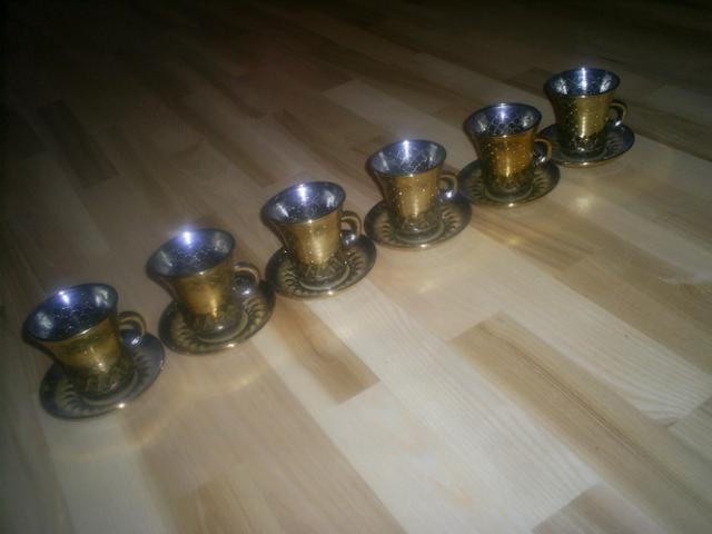 Puodukų rinkinys, nedaug naudotas, su aukso dulkelėmis.