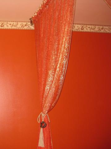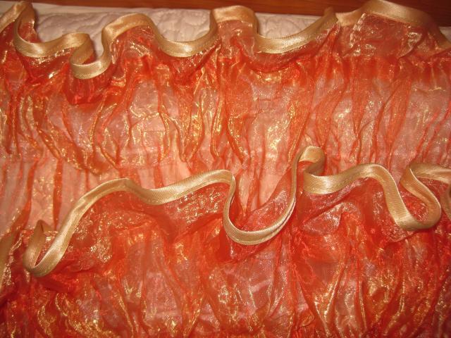 Gražios, turinčios aukso atspalvio užuolaidos. Siūtos užuolaidų salone. Vienos užuolaidos aukštis 2.80 m, plotis 3.86 m. Kitos užuolaidos aukštis 2.80 m, plotis 2.88 m.