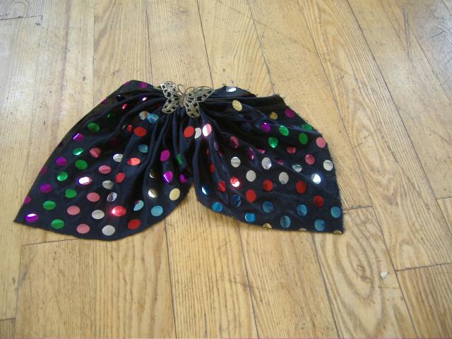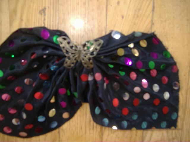 Toks kaip ir kaspinas. Tie ovalo formos taškai blizga įvairiom spalvom. Puošnus. Audinio pagrindas - juodas.