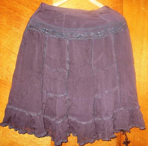 Esu 154 cm ūgio ir sijonas žemiau kelių - matosi nuotraukoje. Pilkos spalvos, nors nuotraukose turi kažkokį melsvą atspalvį. Su prisiūtais karoliukų ornamentais. Šalia užtrauktuko esanti kilputė nutrūkusi, bet užteks ją prisiūti.