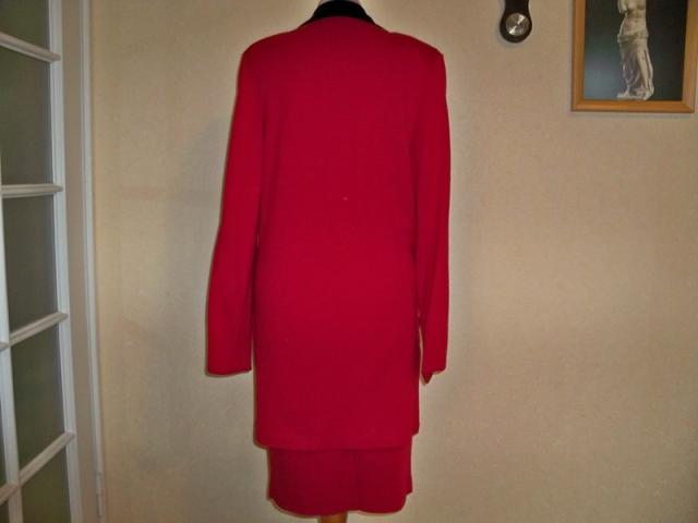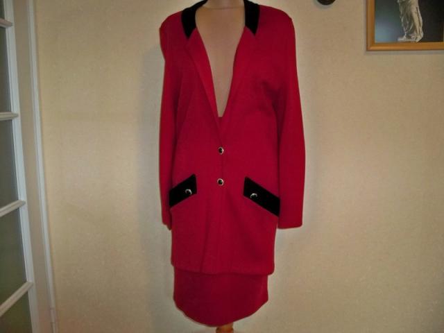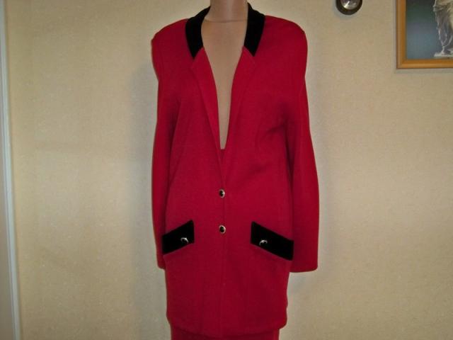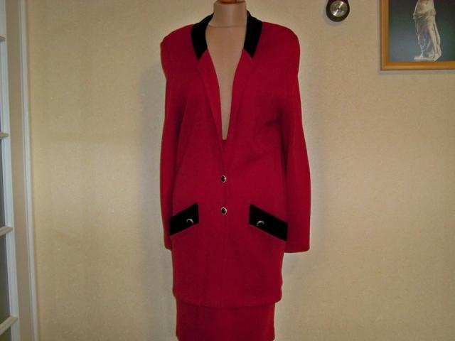 Labai geros būklės ir sudėties, raudona-juoda klasikinis kostiumėlis. Švarkas ilgas, ilgis 85 cm, per liemenį 92 cm, krūtinę 94 cm, rankovių ilgis 66 cm.Sijono ilgis 63 cm, per liemenį 70 cm, klubus 94 cm. Audinys gerai tamposi. Spalva sodriai raudona, gal labiau atspindi 2 foto. NEMAINAU 40 proc. vilna, 60 proc. poliakrilas plius siuntimo išlaidos.
