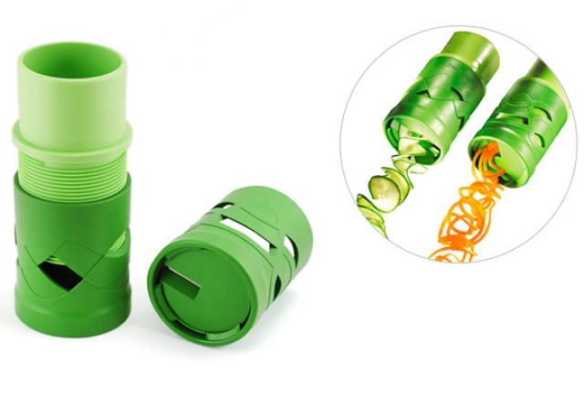 Jeigu Jums pabodo daržoves pjaustyti įprastais kubeliais ar griežinėliais, siūlome išbandyti "Curly Veggies" daržovių pjaustyklę. Ji be vargo pavers agurkus, morkas ar kitas daržoves plonais spagečiais arba nesibaigiančiomis spiralėmis. Naudoti itin paprasta - išsirinkite norimos formos antgalį, įdėkite daržovę į pjaustyklę ir sukite! Galėsite pjaustyti morkas, agurkus, ridikus, jaunas cukinijas, burokėlius, svogūnus ir net bulves. Juk sakoma, kad gražiai atrodantis patiekalas yra ir skanesnis! Įsigyti