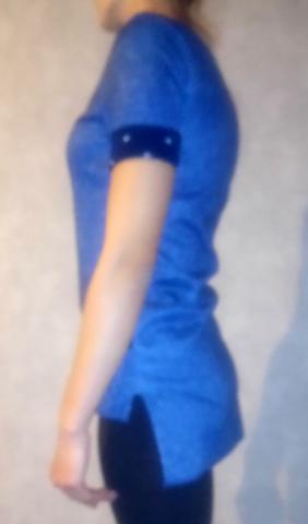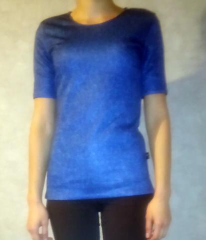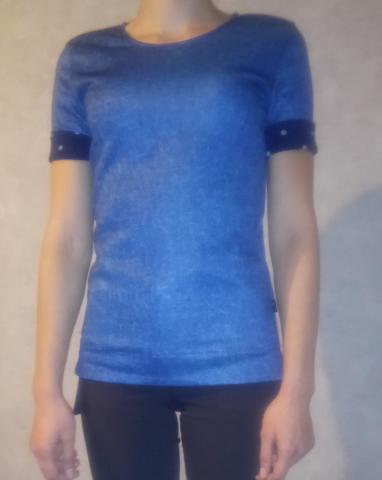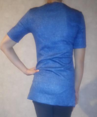 Džinso imitacijos visiškai nauja trikotažinė palaidinė. Rankoves galima atlenkti, kad matytųsi audinys su žirniukais. Šonuose skeltukai, nugara ilgesnė už priekį.