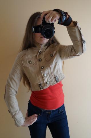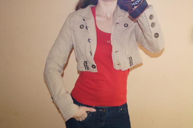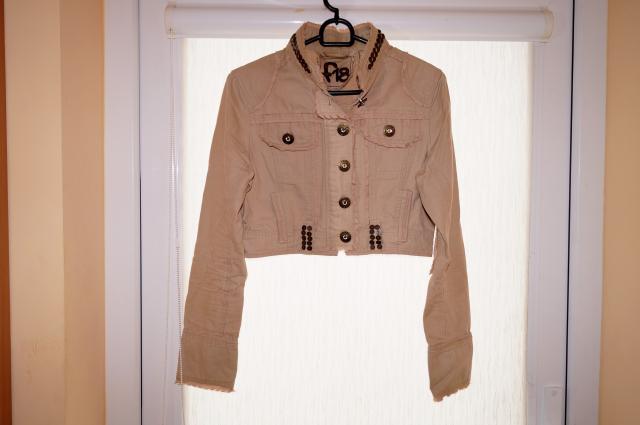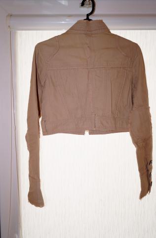 porą kartų užsidėtas trumpas, smėlio spalvos švarkelis. Dydis S -M. Rašo S. Ilgis 38 cm, krūtinė 45 cm, apačioje 41 cm, rankovė nuo pažasties 43 cm, nuo peties 60 cm.