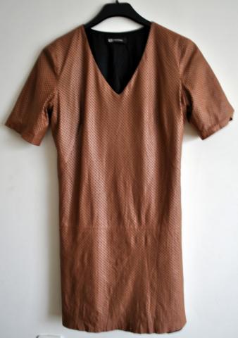 "Monton" suknelė, atrodo kaip odinė, tačiau sudėtis 50% viskozė ir 50% poliesteris. Patogi, truputi auksčiau kelių.