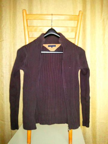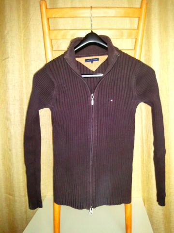 "TOMMY HILFIGER" užsegamas megztinis. Tamsiai rudos spalvos. Užsegamas užtrauktuku. Sportinio tipo. Gerai išlaikytas, nesunešiojamas. Dėvėtas. Sudėtis: medvilnė