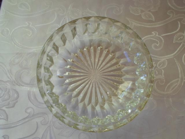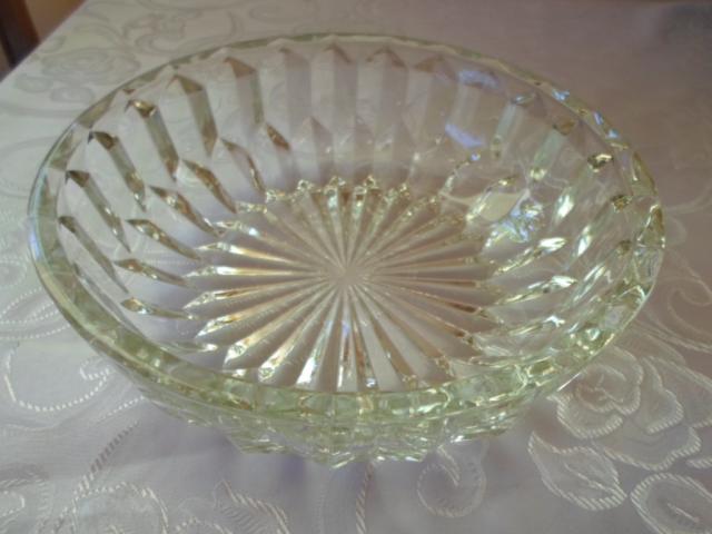 Stiklinė sunki tarybinių laikų vaza saldumynams, vaisiams, salotoms. Skersmuo 21 cm, aukštis 7 cm. Be defektų.