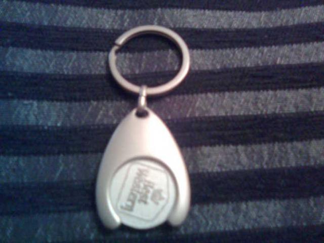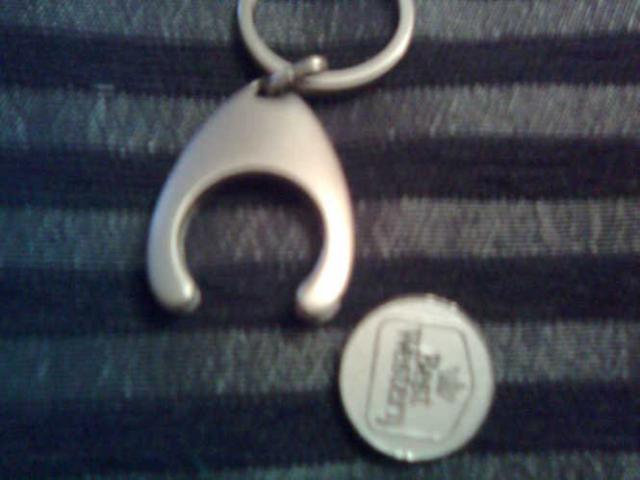 išsiima žetonas su kuriuo galima imti vežimėlius parduotuvėse