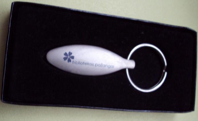 Naujas raktu pakabukas, su dezute, ant pakabuko uzrasas "Bibliotekos pazangai"