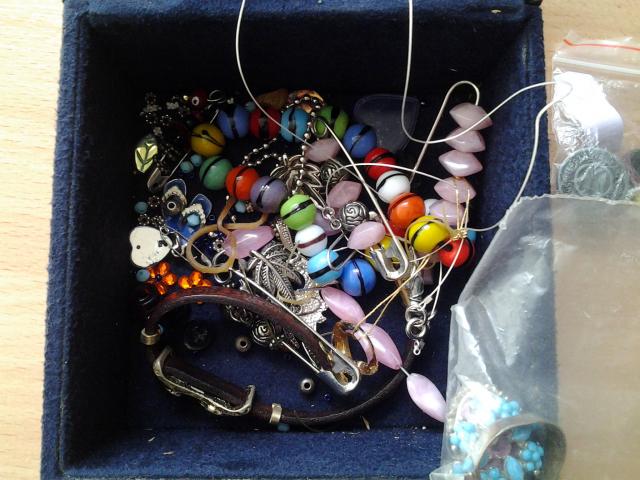Pakabukas zydros slepetes 3lt, dezute 10 lt. Visa kita, kas matosi nuotraukoje, isskyrus apyranke liutas. Spalvotus karolius isemiau sau, bet pridejau papildziau kitu nauju smulkiu daiktu rankdarbiams. Veliau nufotografuosiu ir idesiu naujus.