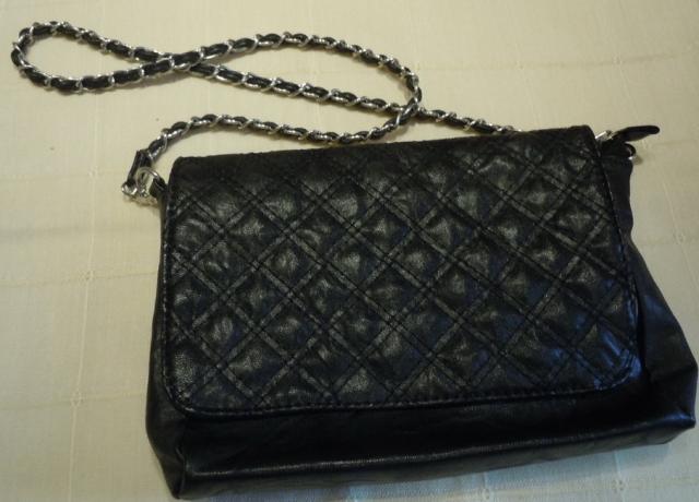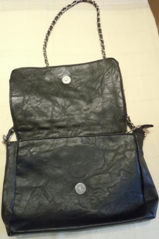 Ne didelė,tipo Chanel juoda rankine. Odos pakaitalas, vidutinio dydzio. Metalines detalės - sidabro spalvos. Ji - 26 cm ilgio -17 cm aukščio- apie 5 cm pločio, vieno skyrelio , viduje 2 kišenėlės ( mobiliam + kita su užtrauktuku), nugarėlėje kita kišenėlė su užtrauktuku. rankenos ilgis 42 cm. `
