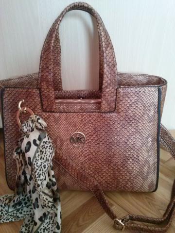 Nauja, pirkta Italijoje, parduotuveje. Pakankamai talpi, ilgas dirzelis, trys dideli skyriai, + skarele, papuosimu, teipa A4 formatas.Ruda