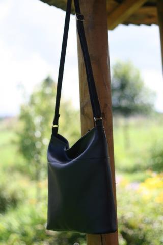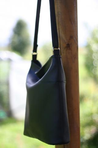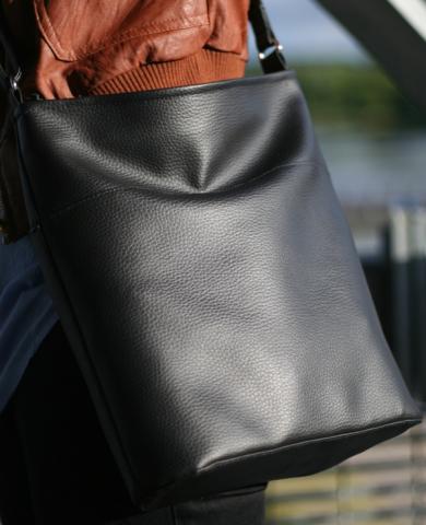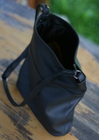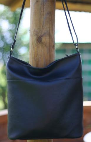 Juoda rankinė su reguliuojamo ilgio rankena. Iš dirbtinės odos. Pamušalas juodos spalvos. Užsegama užtrauktuku. Išmatavimai: plotis - 31cm; ilgis - 29cm; dugno plotis - 8 cm; rankenos plotis - 1,6 cm