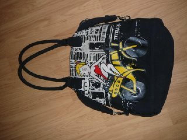 juodos spalvos , medziagine rankine su paveiksleliu , viduje yra pora skyreliu , vienas su uztrauktuku , isoreje taip pat yra kisenele su uztrauktuku