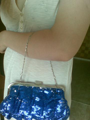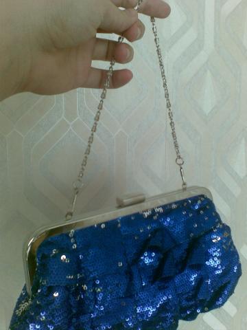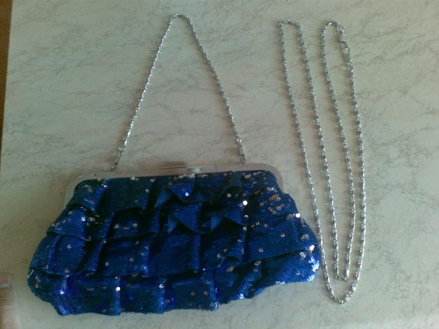 Puiki proginė rankinė su blizgiais "žvyneliais" ir "kvarbatkom", t.y. raikinukais :) Yra dvi grandinėlės - trumpa ir ilga. Mainams 35 Lt
