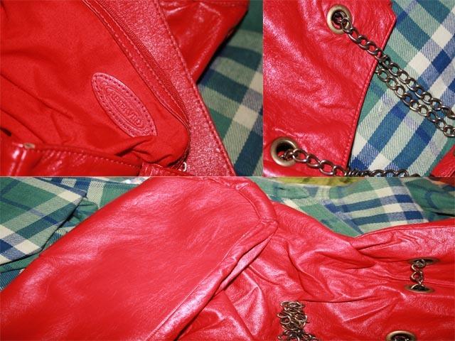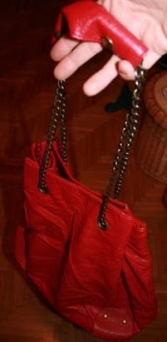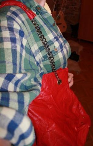 Ryškios raudonos spalvos, rankenos - grandinės aukso spalvos. Nusipirkau, nes labai norėjau, bet kad nedera man prie žieminių paltų ji