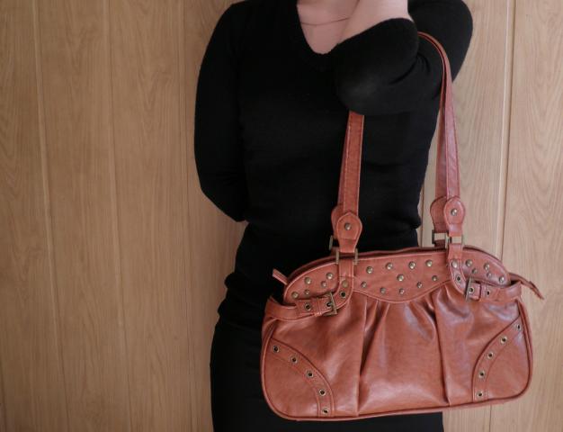 Labai graži rankinė. Ne odinė. Yra defektas - patrinta iš kitos pusės. Matosi antroje nuotraukoje. Galbūt darbščios rankos paslėptų šį trūkumą (pvz. įtvirtinus kniedes ar kitaip). Nešiojant vistiek nesimato. Daugiau jokių trūkumų. Viduje pamušalas naujas, puikios būklės. Viduje šone yra mažas skyrelis su užtrauktuku. Rankenos geros, tvirtos.