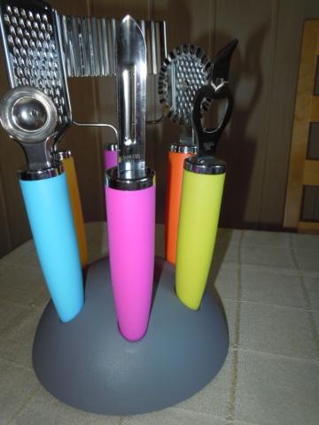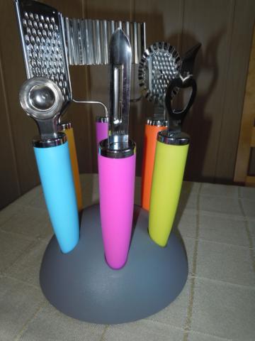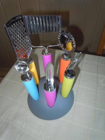 Naujas, sukamas stovas su 6 vnt irankiu. Stovo skersmuo 15 cm. Irankiu ilgis 18-22 cm. Patogu virtuveje
