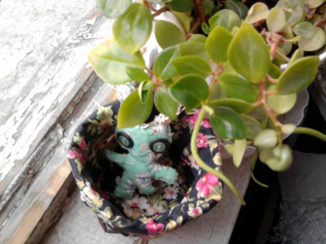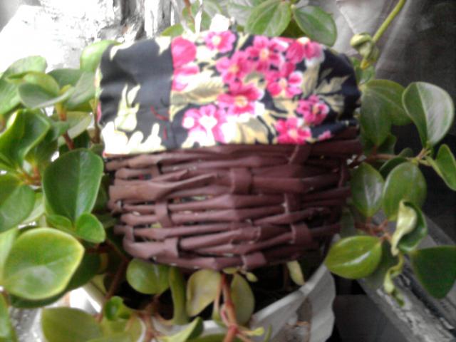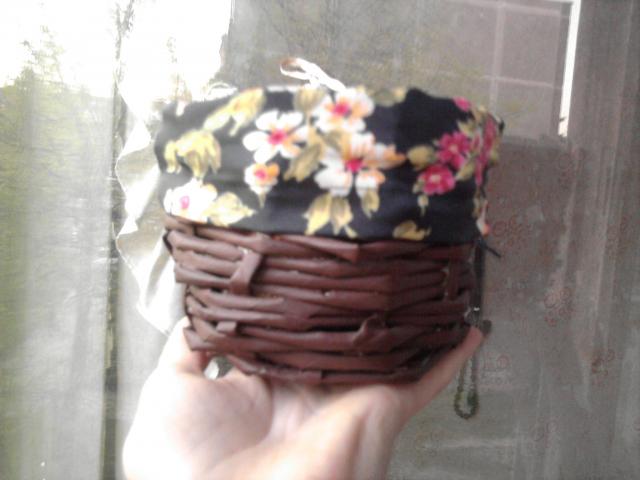 Rankomis pintas rudos spalvos apvalus krepšelis su gėlėtu įsiuvu.. Nedidelis, aukštis apie 12cm.