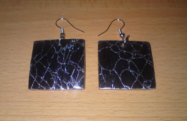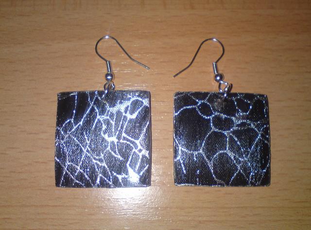 Rankų darbo auskarai. Juodi su sidabriniais raštais. Kabliukai sidabriniai. Dydis 2,5 x 2,5 cm..