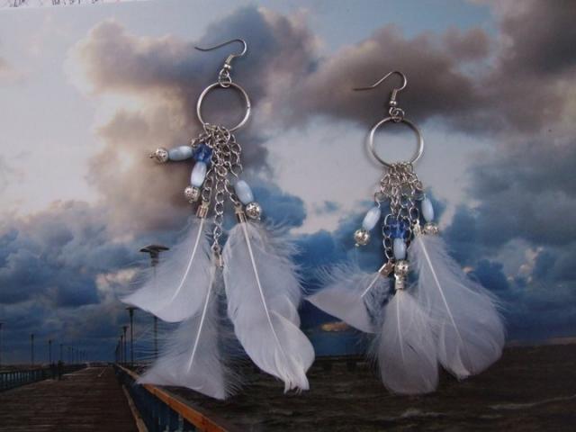 Rankų darbo auskarai. Galiu padaryti ir pagal individualų užsakymą su kitokios spalvos plunksnomis ar karoliukais :] taip pat gaminu papuošalus ir iš kitokių medžiagų. Jei kas domina, kreipkitės ;)