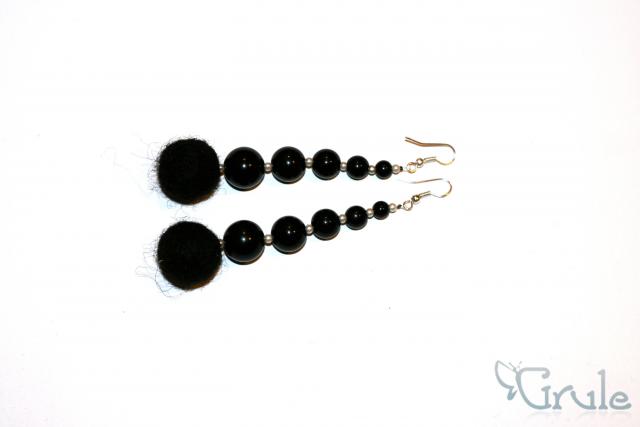 Plastiko ir veltinio burbuliukai. Puošniai atrodantys ilgoki auskarai.